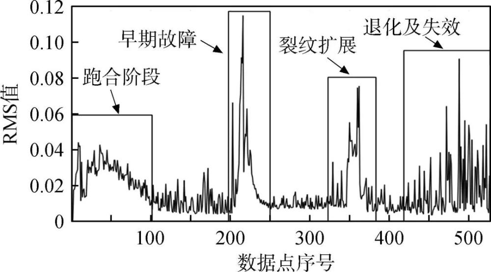 圖2 軸承全壽命實(shí)驗(yàn)聲發(fā)射信號RMS值變化[43]